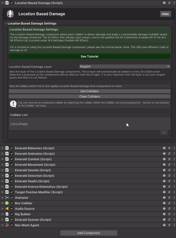 Important: Ensure that the Location Based Damage Layer is not used by any other Emerald AI targets, that it is not the Default layer, and that the layer is exclusively used for the LBD functionality.