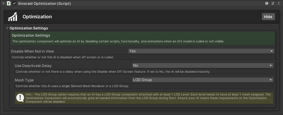 For AI that use multiple Skinned Mesh Renderers, the LOD Group Mesh Type should be used. The LOD Group option requires that an AI has a LOD Group Component attached with at least 1 LOD Level. Each level needs to have at least 1 mesh assigned. The Optimization Component will automatically grab all needed information from the LOD Group during Start. Ensure your AI meets these requirements or the Optimization Component will be disabled.