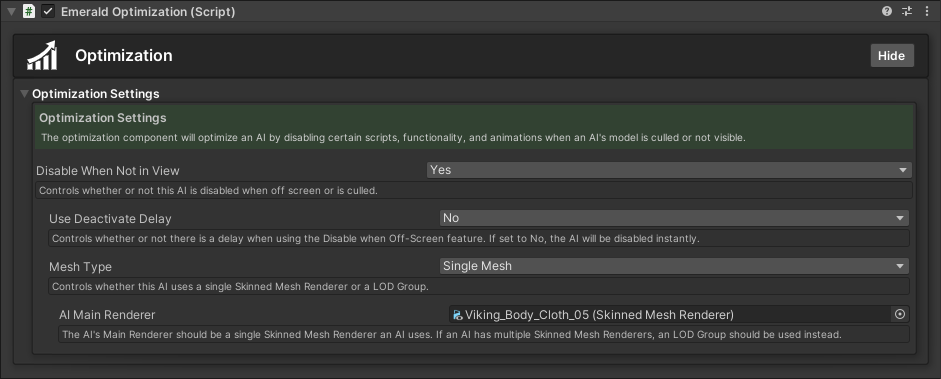 After you have assigned the Optimization Component to your AI, you will need to assign a renderer. For AI who use a single Skinned Mesh Renderer for their model, the Single Mesh Mesh Type should be used.