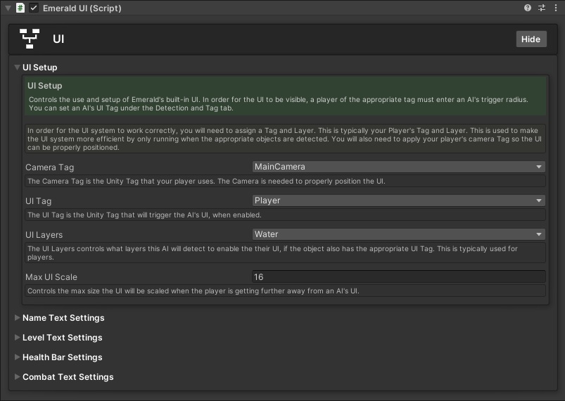 Open the UI Setup foldout and assign your player's Camera Tag, your UI Tag (typically your player's tag), and the UI Layers (typically your player's layer). Your player must be properly set up with Emerald AI for this to work. This means it needs to have an EmeraldGeneralTargetBridge or an EmeraldPlayerBridgescript (will also work if its a custom script derived from EmeraldPlayerBridge).