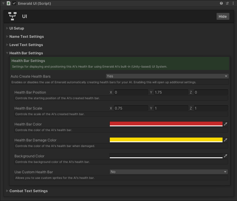 Next, choose which settings/elements you want enabled. These must be enabled through each of the foldouts of the corresponding setting. For this example, the Health Bars are being enabled. Each foldout has various settings for the particular setting. The health bar setting allows users to customize the health bar sprites, colors, position, and scale.&#x20;