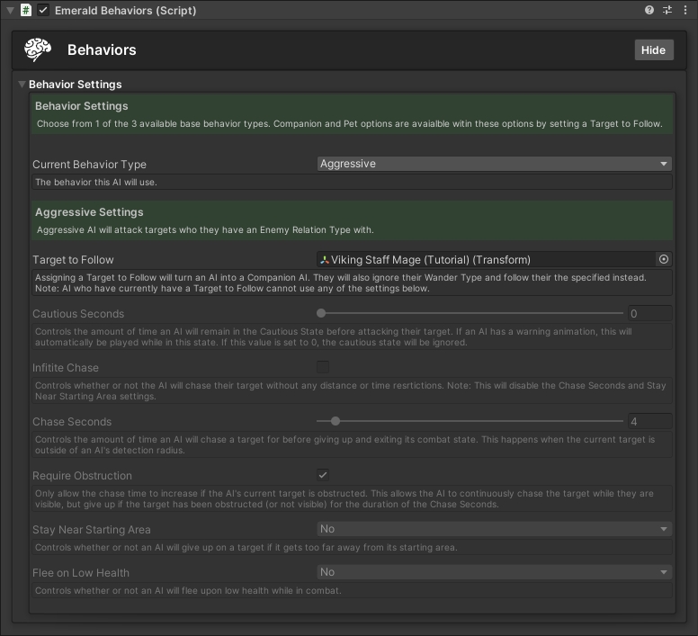 To set an AI's behavior, go to the AI's Behavior Component and expand the Behavior Settings foldout. Set the Current Behavior Type to Aggressive and assign the desired transform to the Target to Follow. This can be either another AI or a player.