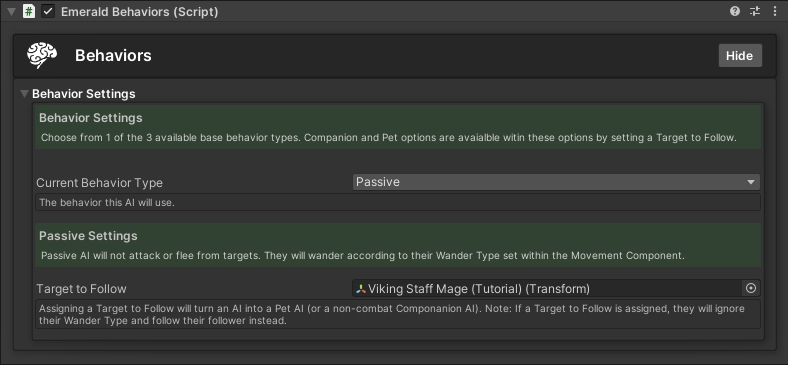To make a Pet AI, simply set the Current Behavior Type to Passive within the Behavior Component and assign the desired Target to Follow.