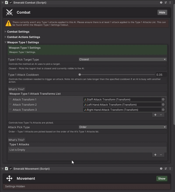 Simply pressing + button to create a new attack element, select the attack animation you'd like the attack to use, assign an Ability Object (one of the demo abilities if you are just getting started), and adjust the Attack and Too Close Distances.