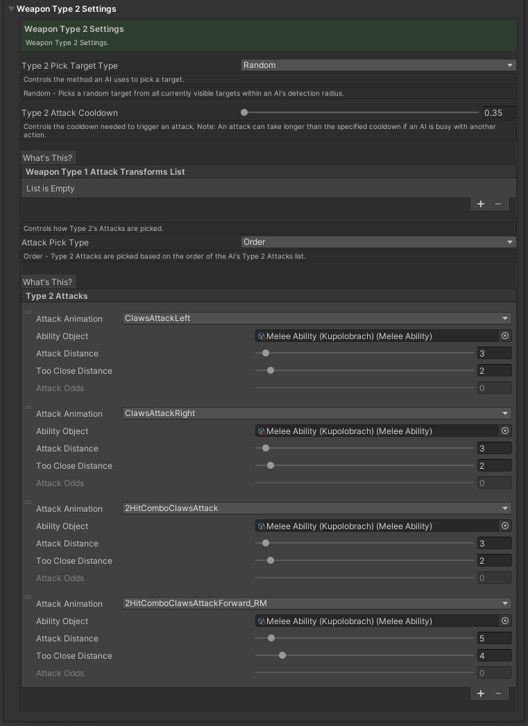 You can use the Weapon Type 2 foldout just like you did with the first weapon type by setting the animations and Ability Objects for each attack. However, these will be based off of the Type 2 Combat Animations from the AI's Animation Profile.