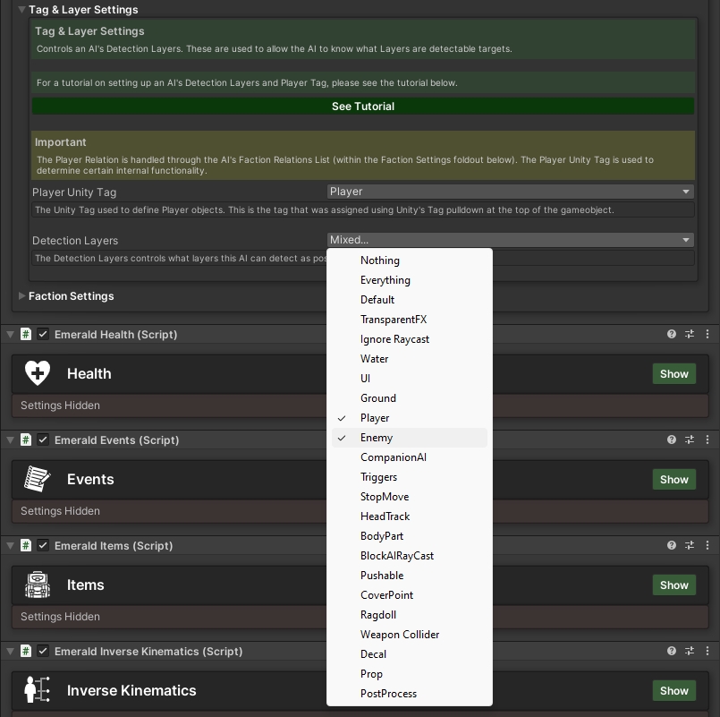 The Tag and Layer Settings controls an AI's Detection Layers and Player Tag. These are used to allow the AI to know what Layers are detectable targets as well as what targets are players.