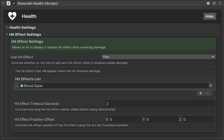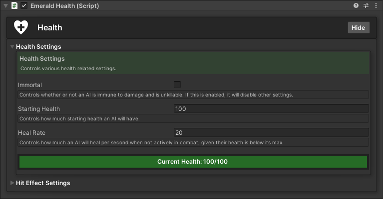 <table data-view="cards"><thead><tr><th></th><th></th><th></th><th data-hidden data-card-cover data-type="files"></th><th data-hidden data-card-target data-type="content-ref"></th></tr></thead><tbody><tr><td></td><td>  Setting up an AI's Health</td><td></td><td><a href="https://content.gitbook.com/content/v03IiZPaMe8fX49a9MnO/blobs/sBm4oEYeXQiMttz6DhP7/HealthSettings.png">HealthSettings.png</a></td><td><a href="health-component/setting-up-an-ais-health">setting-up-an-ais-health</a></td></tr><tr><td></td><td><p>           Setting up an </p><p>          AI's Hit Effects</p></td><td></td><td><a href="https://content.gitbook.com/content/v03IiZPaMe8fX49a9MnO/blobs/J1pJSMeR0PjVtOpZuMfF/HitEffectSettings.png">HitEffectSettings.png</a></td><td><a href="health-component/setting-up-an-ais-hit-effects">setting-up-an-ais-hit-effects</a></td></tr></tbody></table>