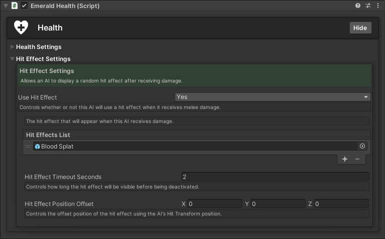 The Hit Effect Settings controls whether or not an AI will play a hit effect when it receives damage. This is based on a list of hit effects set by the user. These hit effects are picked randomly each time the AI receives damage. The position in which a hit effect is spawned is based on the AI's Target Position Modifier component. However, if an AI is using a Location Based Damage component, the position of the hit effect will automatically be based on the bone/transform that was hit.