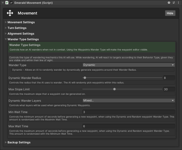Note: It is important that users set the Dynamic Wandering Layers (based on their project) as these control what layers are allowed to receive waypoints. By default, this layer is set to Default.
