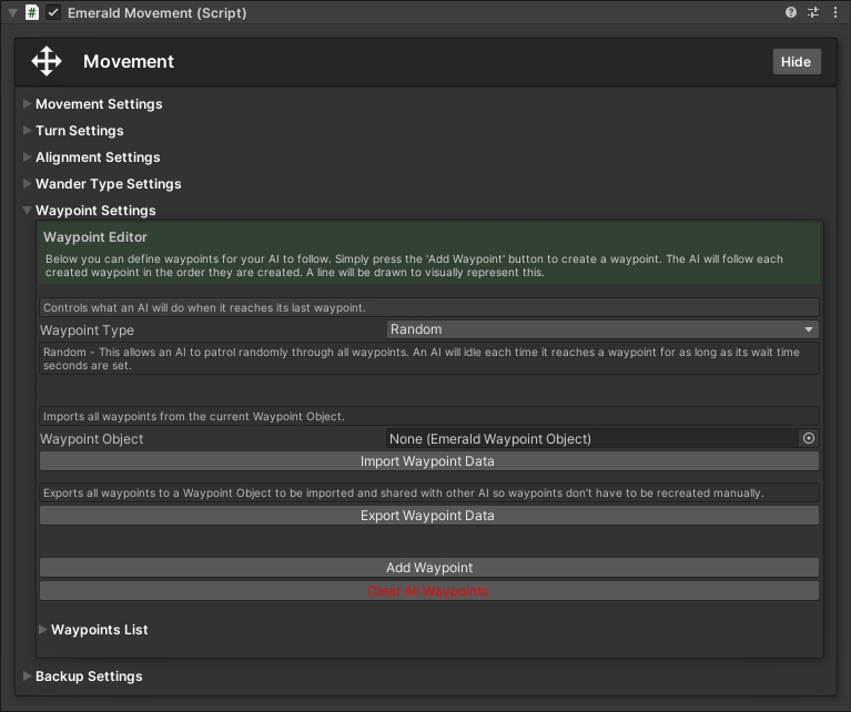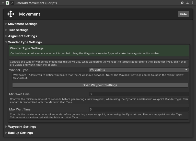 In order to access the Waypoint Settings, the Wander Type needs to be set to Waypoints. This will open up an additional foldout called Waypoint Settings. This can also be accessed by pressing the Open Waypoint Settings button within the Wander Type Settings foldout.