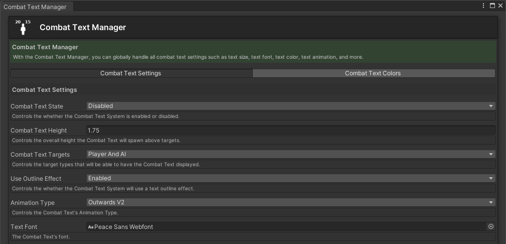 The Combat Text Color Settings allow you to control all color related settings for the Combat Text System. Player damage text needs to be called programmatically to work for custom character controllers. This is explained in the code section below.