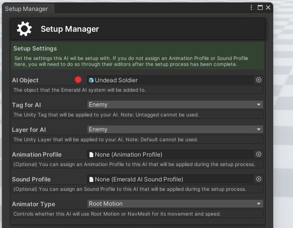You should now be able to see the Setup Manager. Look for the AI Object slot and assign the object you would like to be an AI. This object should have an Animator on it. There are text boxes that explain what every setting does and is used for.