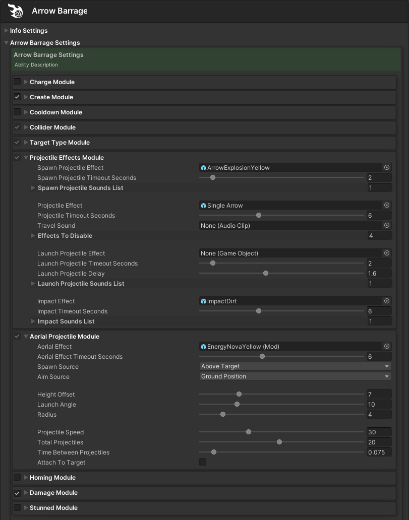You will then have a new Aerial Projectile Ability to customize with various modifiers, effects, sounds, delays, and more through the Projectile Effects and Ground Projectile modules.
