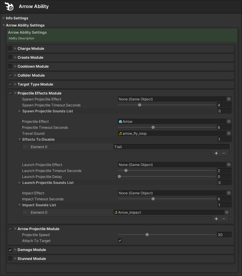 You will then have a new Arrow Projectile Ability to customize with various modifiers, effects, sounds, delays, and more through the Projectile Effects and Arrow Projectile modules.