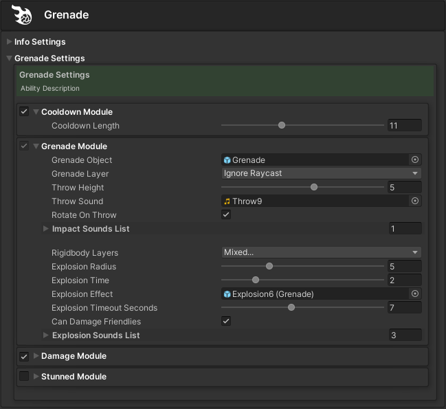 This is the Grenade Ability Object that was used to create the ability in the above example clip.