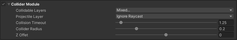 **Note:** If you need your projectile to have a collider other than the generated Sphere Collider, you can assign your own custom collider to the Projectile Effect slot (from the Particle Effect Module) and that will be used instead. The Projectile Layer will still be assigned as if using the default Sphere Collider.
